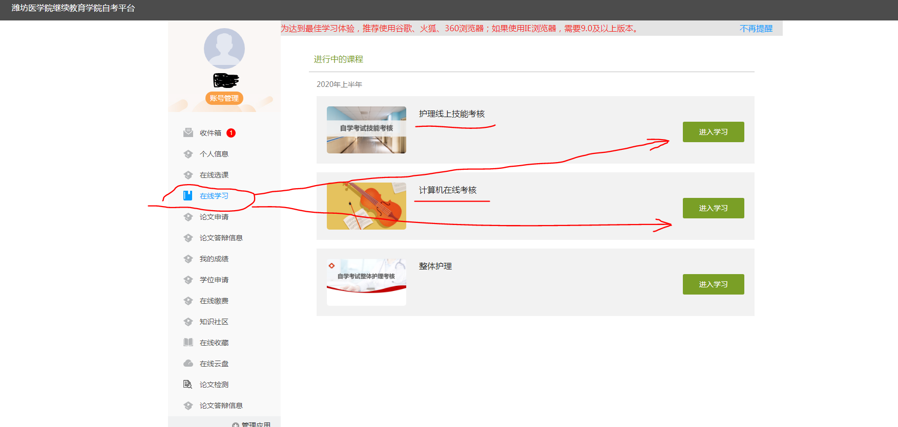 已在山东省教育招生考试院报名参加2020年上半年自考护理学操作技能考核的考生;已报名参加自考计算机考核的社会考生请注意:受疫情影响,护理操作技能考核与自考计算机考核两个项目将在“潍坊医学院自学考试在线平台”(网址:wfmczk.jxjy.chaoxing.com/mh)的“在线学习”栏目进行考核,考核以在线答题形式完成。请相关考生在2020年6月17日至6月18日两天时间内登录“潍坊医学院自学考试在线平台”完成已报名的相关考核。自考平台上的考核路径请参考本通知附件的图示。