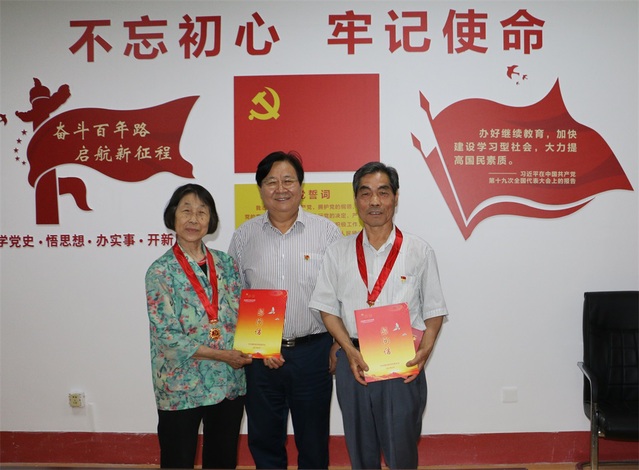 孙宏伟代表学校为在党50年的老党员颁发了“光荣在党50年纪念章”、慰问信和慰问金。孙宏伟向长期以来为学校继续教育事业作出重要贡献的老同志表示衷心感谢、致以崇高敬意。他说,老党员是我们党和国家的“宝”,是我们学校的“宝”,我们学校建校70年取得的辉煌成就,离不开老党员为学校改革发展做出的重要贡献,同时也希望老党员一如既往的支持学校支持继续教育工作,发挥余热,并祝愿老党员身体健康、生活幸福。